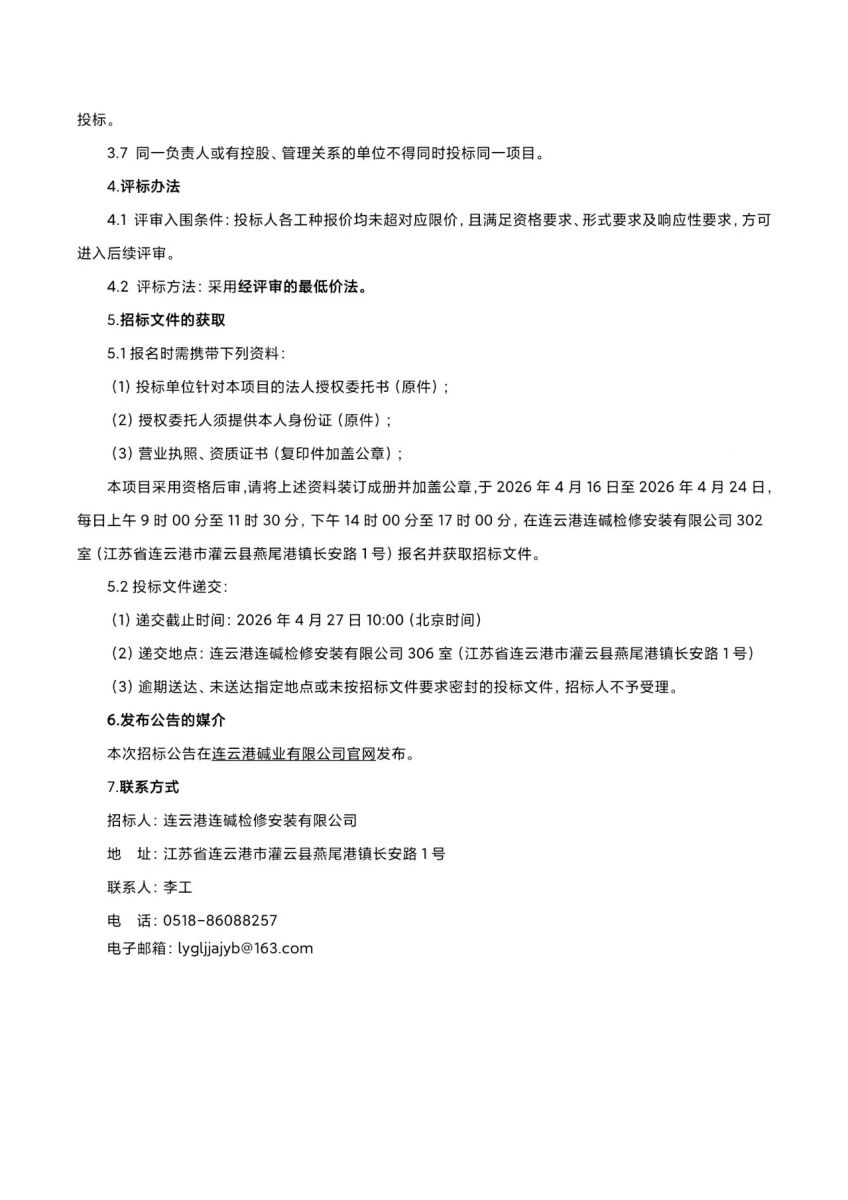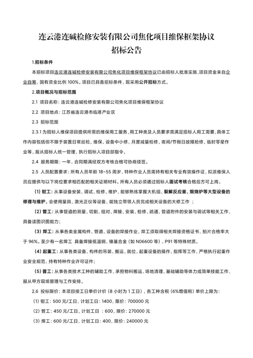 連云港連堿檢修安裝有限公司焦化項(xiàng)目維保框架協(xié)議招標(biāo)公告